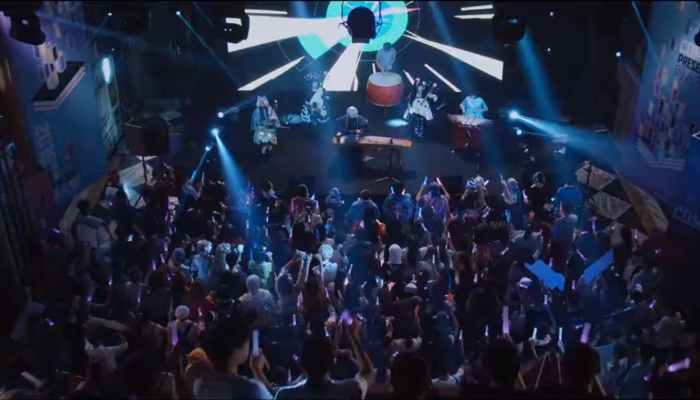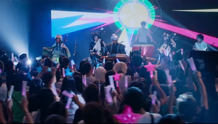 El show principal presenta a un grupo idol y al ensamble “Dimensión 2.5”. La primera se vincula a la cultura idol, género que proviene de Japón y que a su vez bebe de otros estilos occidentales. Este género se vincula a la modernidad y la tradición no solo porque nace por un proceso de globalización (4), sino también porque la concepción de sus cantantes se puede vincular a la construcción del cuerpo y las deidades en Japón. Por otro lado, la segunda banda performa música ancestral, la cual ya hemos visto, une elementos de la música folklórica china con otros más modernos, como la ropa en el caso de la convención o instrumentos y tecnologías contemporáneas, como se podrá apreciar en la última presentación, casi al final de la película.