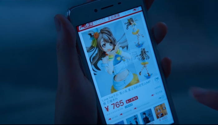 Por lo tanto, no es gratuito que la película nos muestre diferentes referencias al anime: los pósters en el dormitorio 502, el centro de convenciones de ACGD y las figuras que Jing Chen debe comprarles a las chicas -entre los cuales reconocemos a Kotori Minami de Love Live!, personajes de Kuroshitsuji, Kancolle y Touken-Ranbu-.