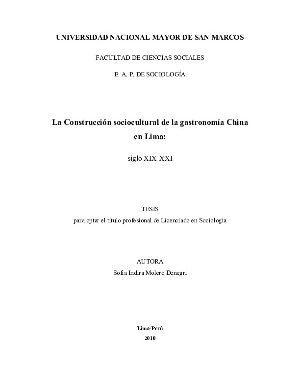 Molero Denegri, S. (2010). La construcción sociocultural de la gastronomía China en Lima: siglo XIX-XXI [Tesis de licenciatura. Universidad Nacional Mayor de San Marcos] Repositorio Cybertesis UNMSM. https://hdl.handle.net/20.500.12672/180