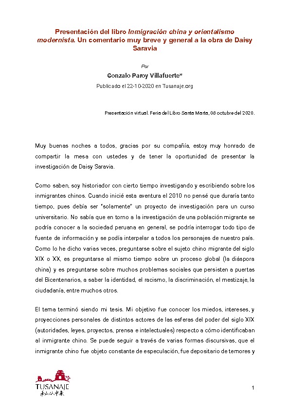 Paroy, G. (20 de octubre de 2020). Presentación del libro Inmigración china y orientalismo modernista. Un comentario muy breve y general a la obra de Daisy Saravia. Lima: Tusanaje.