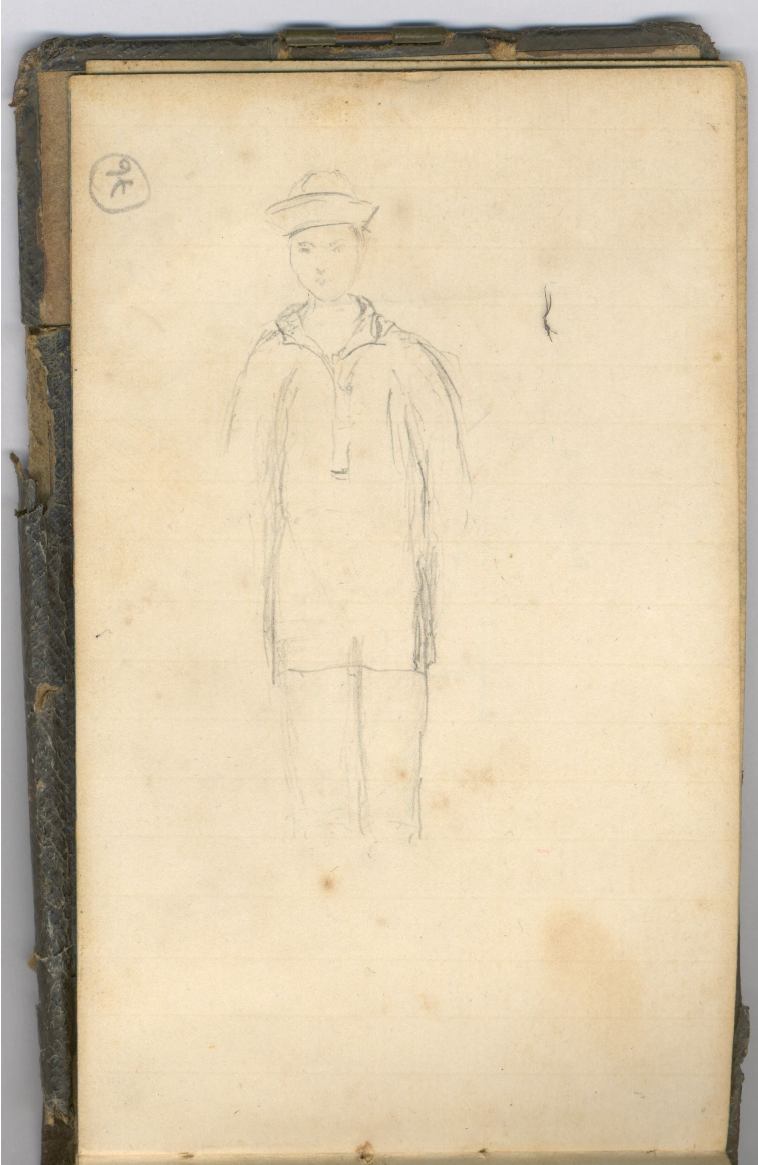 Boceto de un trabajador chino en las Islas de Chincha realizado por Antonio Raimondi en su libreta de viaje entre los años 1852 y 1853.