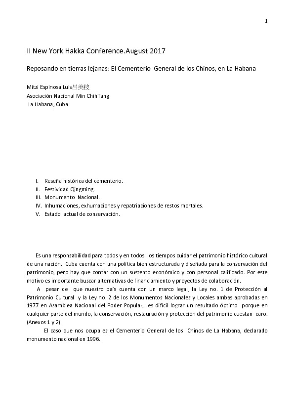 Espinosa, M. (2017). Reposando en tierras lejanas: El Cementerio General de los Chinos, en La Habana. II New York Hakka Conference. Conferencia llevada a cabo en New York, Estados Unidos.
